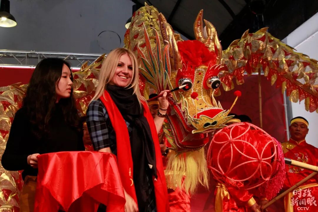 △雅典市副市长伊娃·孔托斯塔萨库在2019年雅典市“欢乐春节”活动中为龙点睛。(来源:雅典中国文化中心)